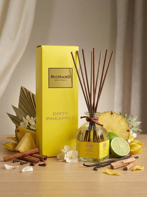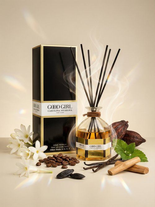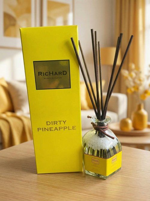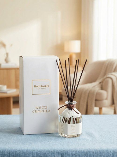 - Дизайн: шестигранный стеклянный флакон с декоративными белыми гранулами, 6 чёрных ротанговых палочек, перевязанных коричневой верёвкой. Элегантная упаковка в бежево-золотистых тонах подчёркивает премиальность продукта.